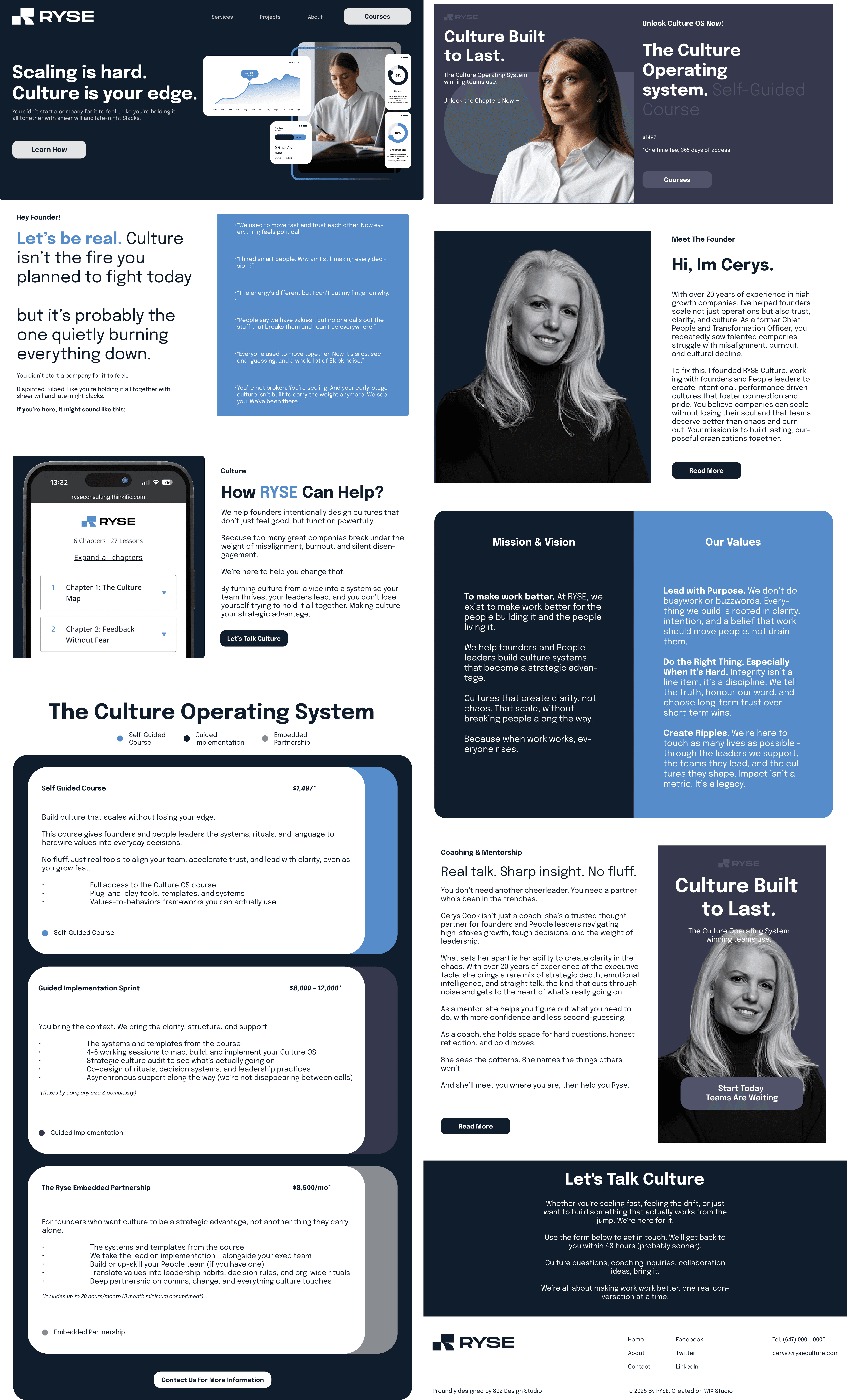 Once Cerys chose the final logo, I carried the identity into digital touchpoints. I designed and continue to refine her website, making sure it reflects RYSE’s modern, culture-first personality. Alongside that, I’ve been editing her course videos and building out supporting content — ensuring the brand feels cohesive across every platform, from her online presence to her learning materials.