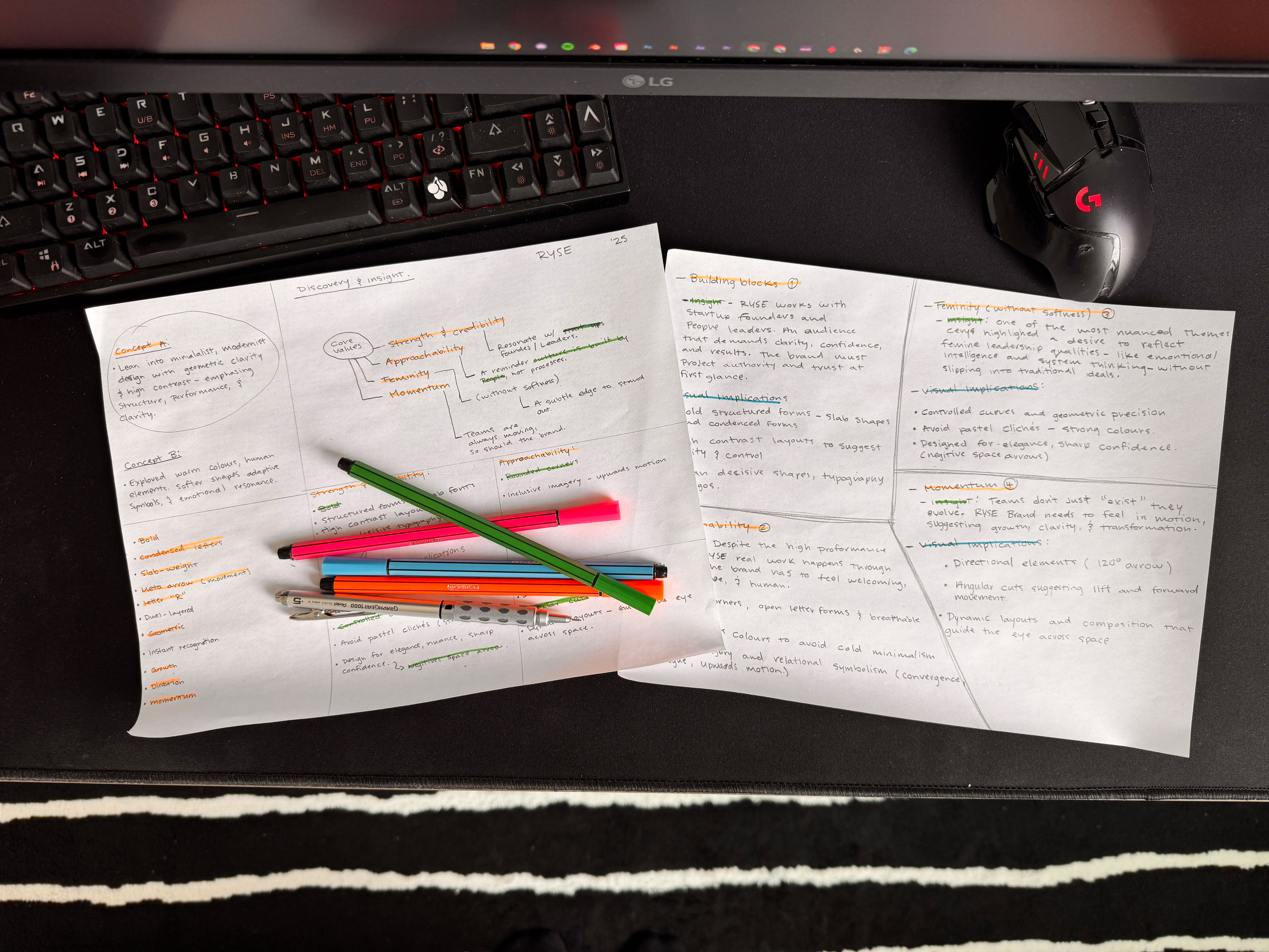 Through collaborative conversations with Cerys from RYSE, we uncovered a set of deep brand values that would go on to guide every visual decision. These weren’t just keywords; they were themes that needed to be felt across the whole identity system. I grouped them into four core pillars.