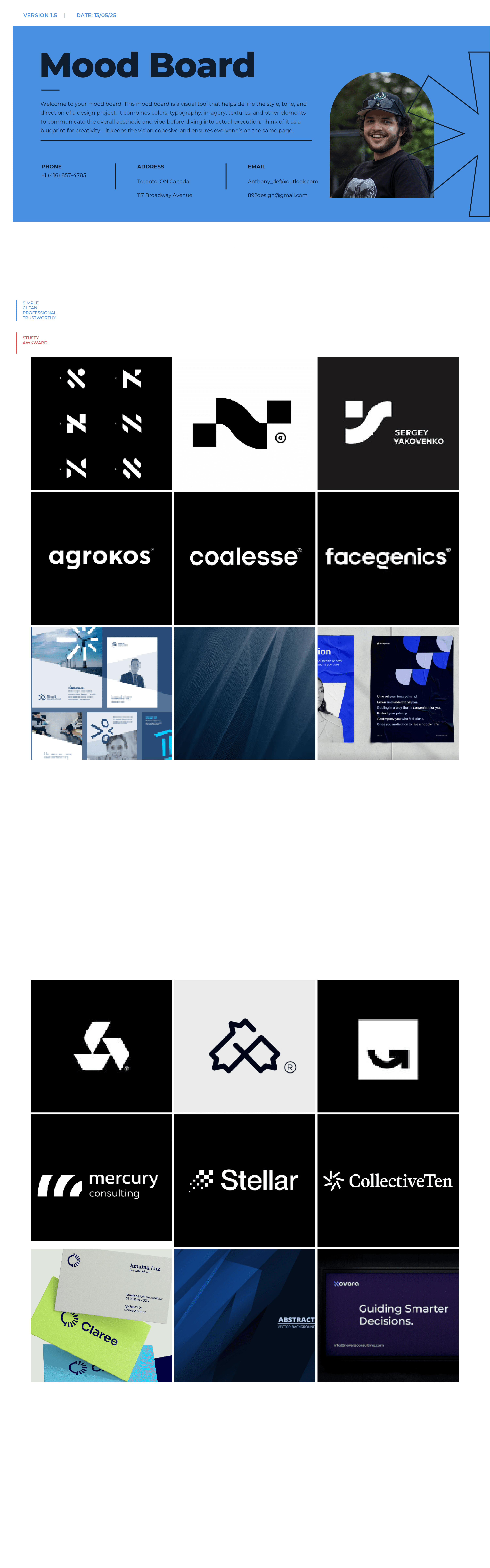 From there, I pulled together a mood board and shared it with Cerys. This gave us a chance to see how those values might come to life visually and to check what was landing (and what wasn’t) before I started sketching logo ideas. I like using mood boards at this stage because they’re a quick way to test the waters and make sure we’re on the same page before diving deeper into design.